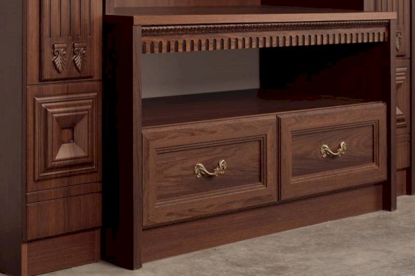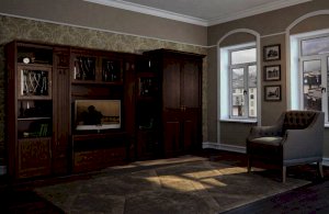 Классическая серия «Лючия» включает 12 модулей для гостиной и кабинета.  Запоминающийся облик коллекции «Лючия» обеспечивают оригинальные дизайнерские приёмы: торцевые и внутренние модули-колонны, сложная радиусная гравировка и фигурная фрезеровка в сочетании с объемными декоративными элементами. Мебель оснащена надежной немецкой фурнитурой «Hettich» и роскошными итальянскими ручками подсостаренное золото, что является несомненным плюсом ко всем ее достоинствам.