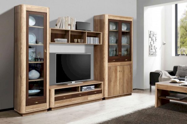 Комбинированный шкаф не зря получил такое название. Он сочетает в себе и витрину, и комод, и тумбу! Модуль разделен на несколько частей, у каждой из которых – свои задачи. Верхняя часть шкафа представляет собой витрину: две распашные стеклянные дверцы заключены в изящную рамочную конструкцию, открываются навстречу друг другу, а внутри – три широкие и глубокие полки из ЛДСП, каждая из которых выдерживает вес до 5 кг. Можно поставить фамильный сервиз или книги. Под отсеком-витриной находятся два выдвижных ящика. Они предназначены для документов и других бумаг. Под ними тоже находятся две полки с распашными дверцами, но в отличие от верхней части – эти дверцы с закрытыми фасадами.
