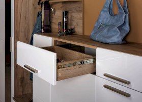 Фурнитура: Пластиковые обувницы, выдвижные ящики на шариковых направляющих полного выдвижения, пластиковые ручки.