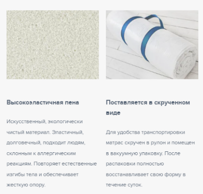 Матрас выполнен на основе монолитного блока из гипоаллергенного, влагоустойчивого и долговечного материала Foam. Благодаря высокой степени упругости обеспечивает идеальный анатомический эффект. Чехол изготавливается из хлопкового жаккарда, простеганного на синтепоне. Благодаря составу чехол хорошо пропускает воздух и сохраняет тепло. Для удобства транспортировки матрас Flex скручен в рулон и помещен в вакуумную упаковку. После распаковки полностью восстанавливает свою форму в течение суток.