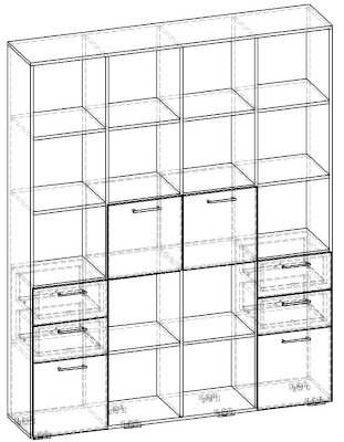 Применение задней стенки из ЛДСП (в ячейках с ящиками и фасадами) позволяет использовать данный стеллаж для зонирования пространства (чтобы предотвратить опрокидывание, необходимо обеспечить крепление стеллажа к стене).