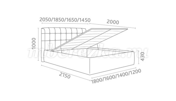 Кровать доступна в 4-х размерах:  1200, 1400, 1600 и 1800 мм.