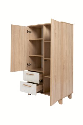Створки оснащены петлями с доводчиками, ящики — шариковыми направляющими полного выдвижения и ручками из натурального массива дуба. В конструкции стеллажа предусмотрен механизм открывания нажатием «push-to-open».